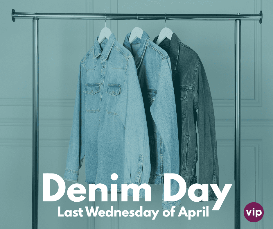 - Businesses can launch a Denim Day fundraiser by asking staff to donate $2-$5 (or more) to wear jeans for the day! Snap a picture and donate the funds to VIP to be featured!